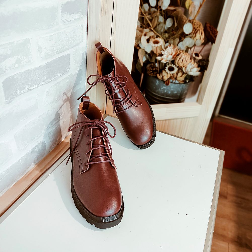 採用芋粉與酒紅色系讓短靴更豐富多元
